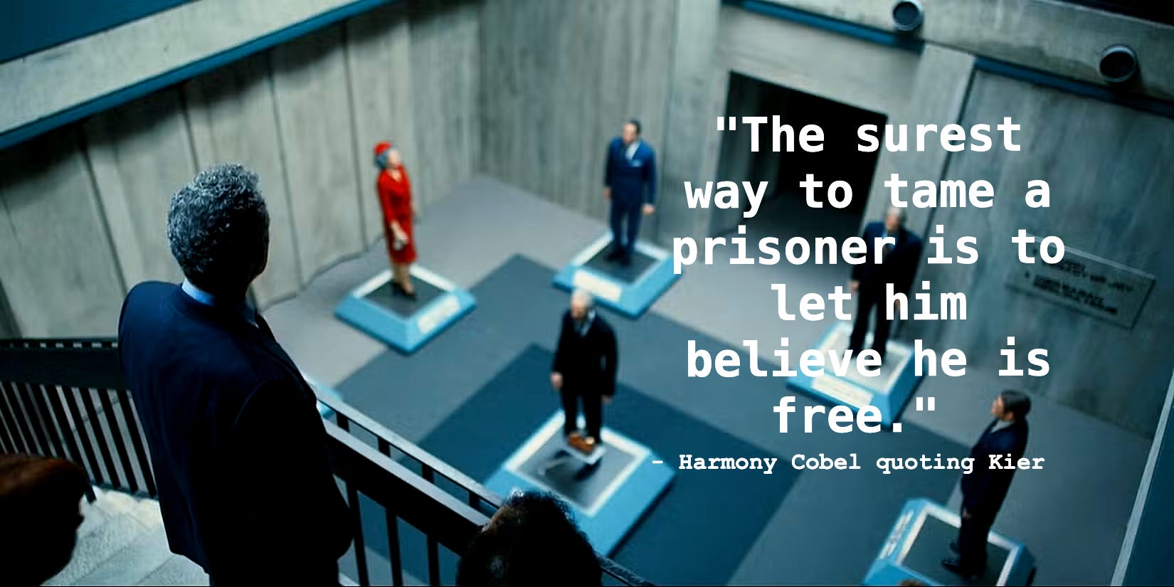 This concept maps cleanly onto the internal structure of Lumon. Like Tremblay and Richelieu, Lumon’s visible hierarchy is split between figurehead and faceless functionary. The company’s shadowy “Board” never speaks directly and is mediated through proxies. Kier Eagan, mythologized into a paternal icon, is the more visible figurehead. Part Richelieu, part capitalist prophet. But the true operators, the ones who define the logic of the Lumon world, the contours of Macrodata Refinement, and the limits of Innie knowledge, remain unnamed. As with the opaque inner circles of real-world institutions and governments—defense contractors, intelligence agencies, corporate lobbying arms—Lumon simulates transparency while veiling its core functions.